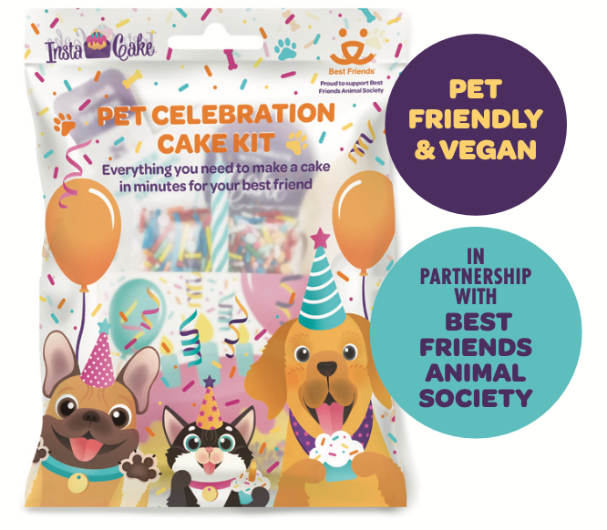 Best Friends Pet Vegan Vanilla Cake Mix\InstaCake Cards are made in our Canadian peanut-free facilities from the highest quality ingredients. Every card includes: Baking Case Cake Mix Frosting Water Measure Mixing Spoon Rainbow Sprinkles Celebration Topper Fun Candle*