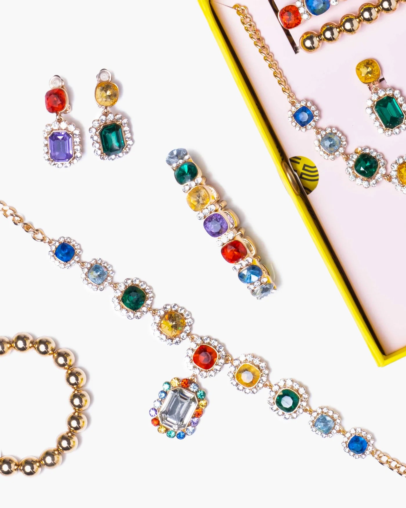 The Rainbow Sparkles Mega Set adds extra fun to your look. It's like rainbow sprinkles, but for your outfit, and totally worth the brain freeze! Set includes necklace with red, green, yellow and blue gem accents along a gold-tone chain, with a large emerald-cut pendant surrounded by multicolored gems, a pair of mis-matched dangle clip-on earrings, and two bracelets: one multicolored gem and one large gold beaded balls.